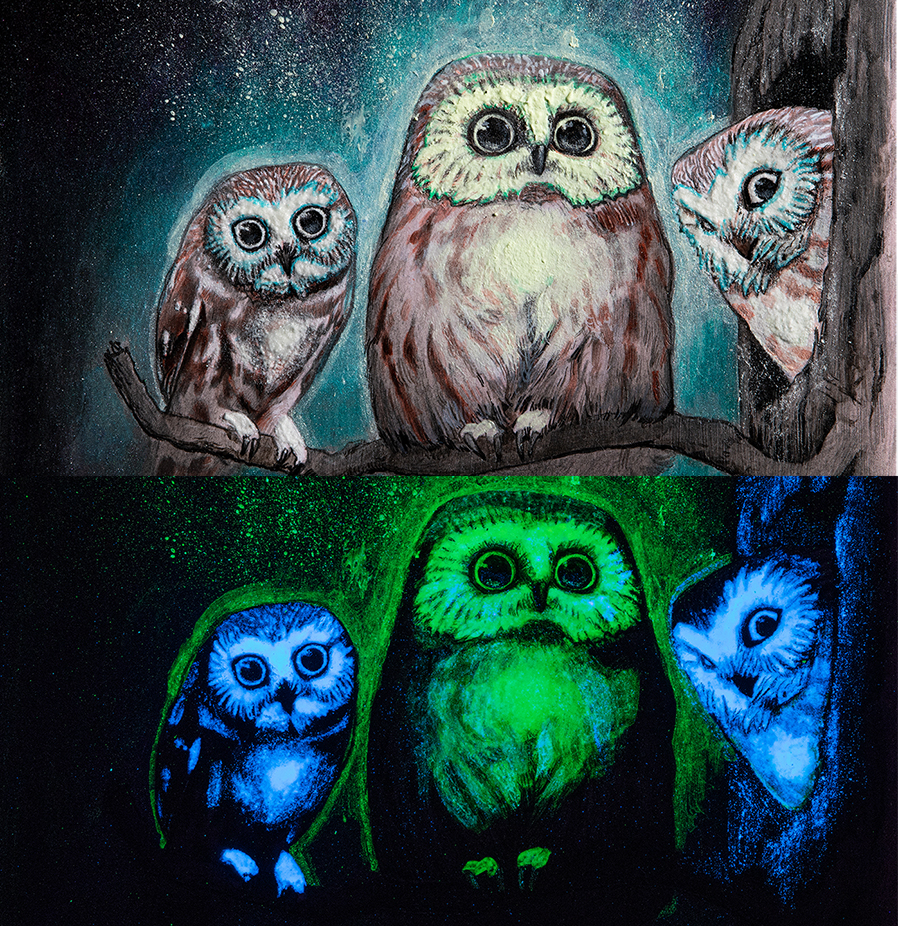 2/Observe artwork in a very dark room and allow your eyes to adjust to appreciate the glow. Even in a dimly lit room you can see them glowing, but a dark room is better.