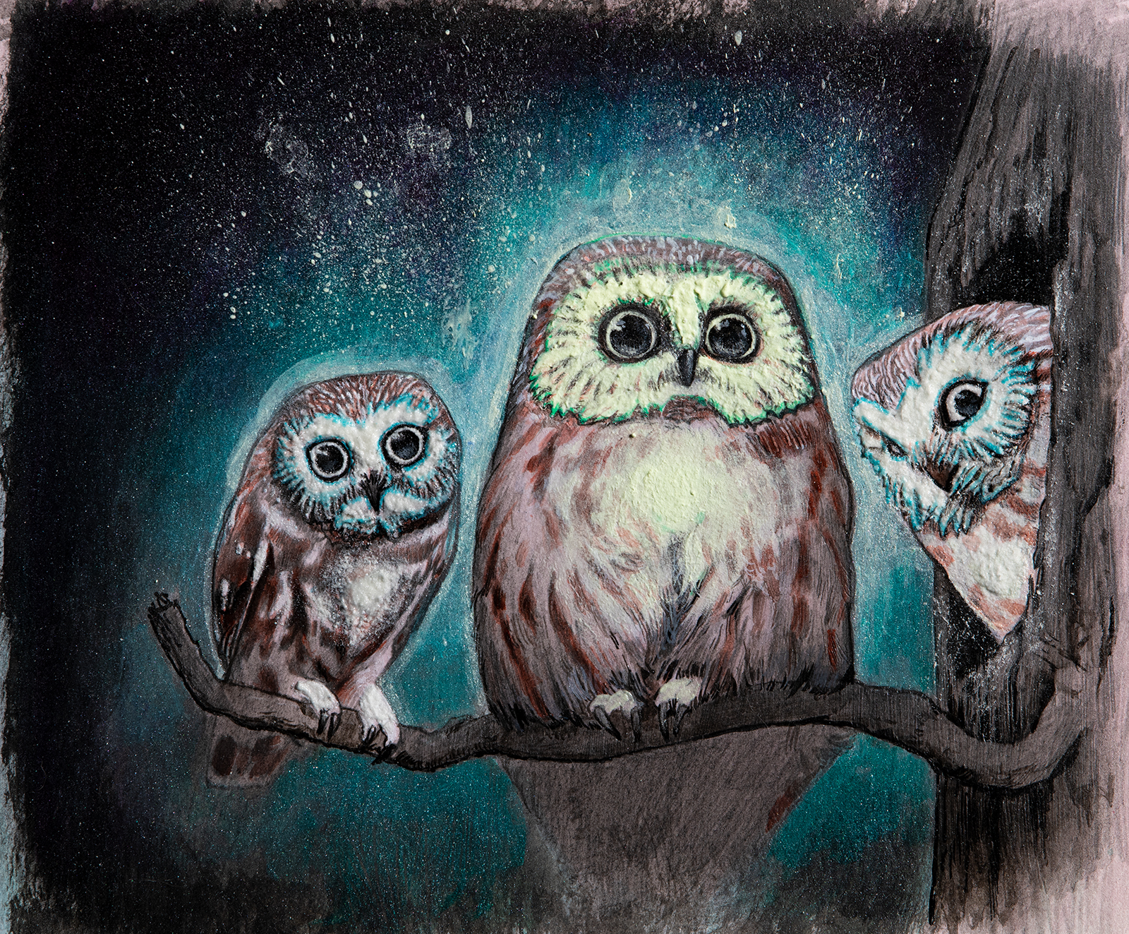 This artwork measures 8" x 9" in size and consists of pencil, pastel, acrylic, oils, ink and phosphorescent glow in the dark powder.