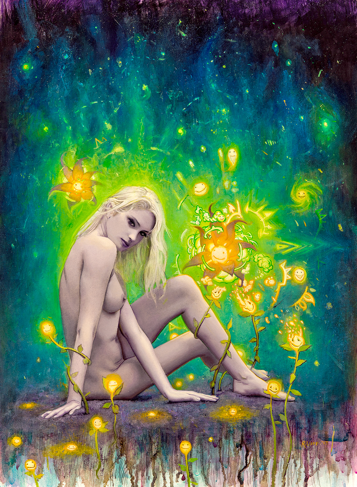 The artwork measures 14" x 20" and consists of Oils, Pencil, Pastel, Iridescent Medium on heavy fabriano watercolour paper mounted to Cradled Panel.
