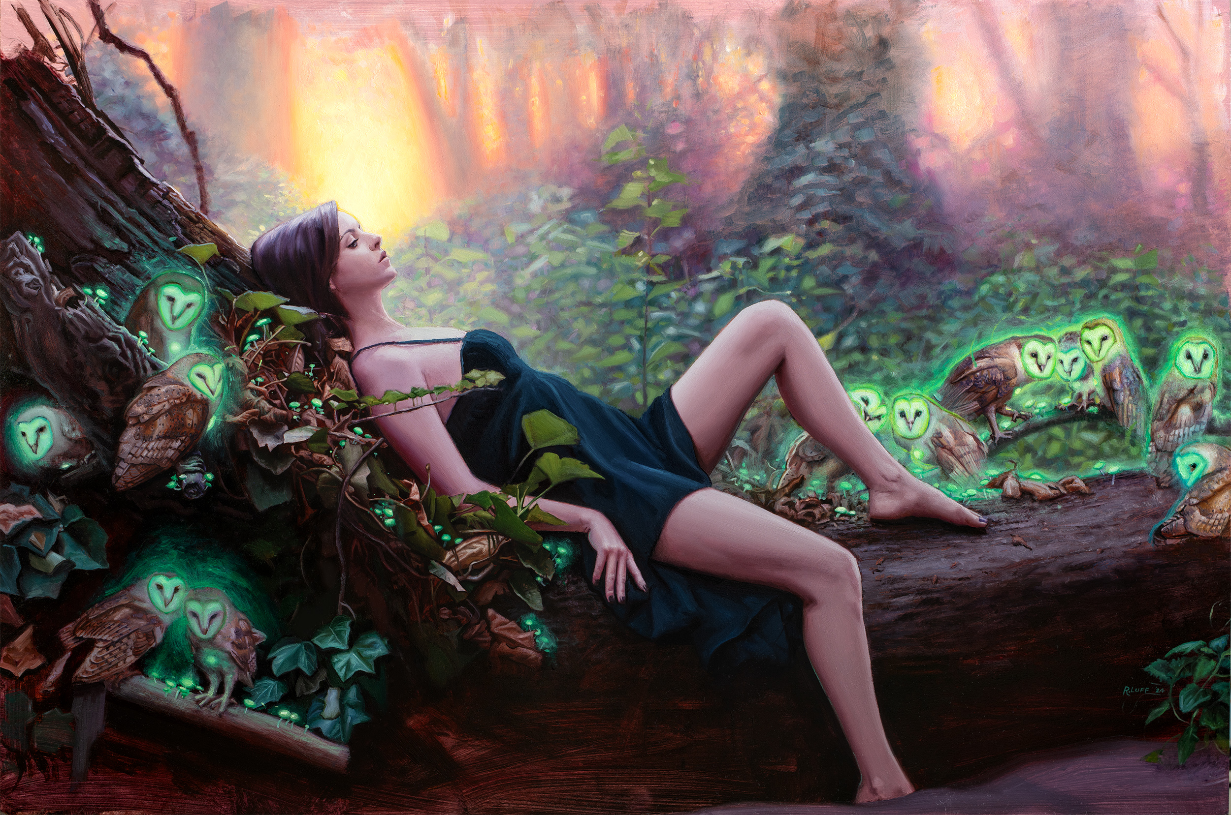 New original oil painting on cradled panel that measures 20" x 30". This painting is part of the Neon Forest/ Owl Song theme that I've been pursuing for the past 10 years and represents my journey through mixed media drawings to fully finished oil paintings.